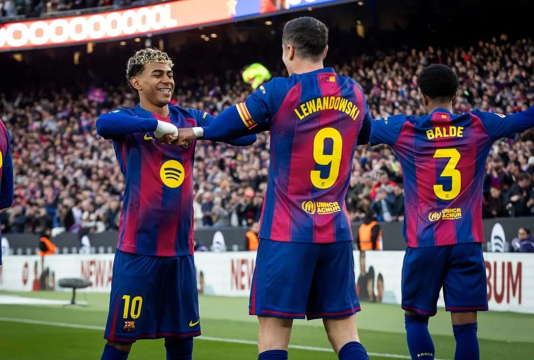 Уже на 4-й минуте команда Флика повела — Роберт Левандовски мощным ударом пробил ворота соперника. Перед перерывом каталонцы удвоили преимущество — Ламин Ямаль отдал голевой пас шведой на Феррана Торреса, который превратил его в гол.